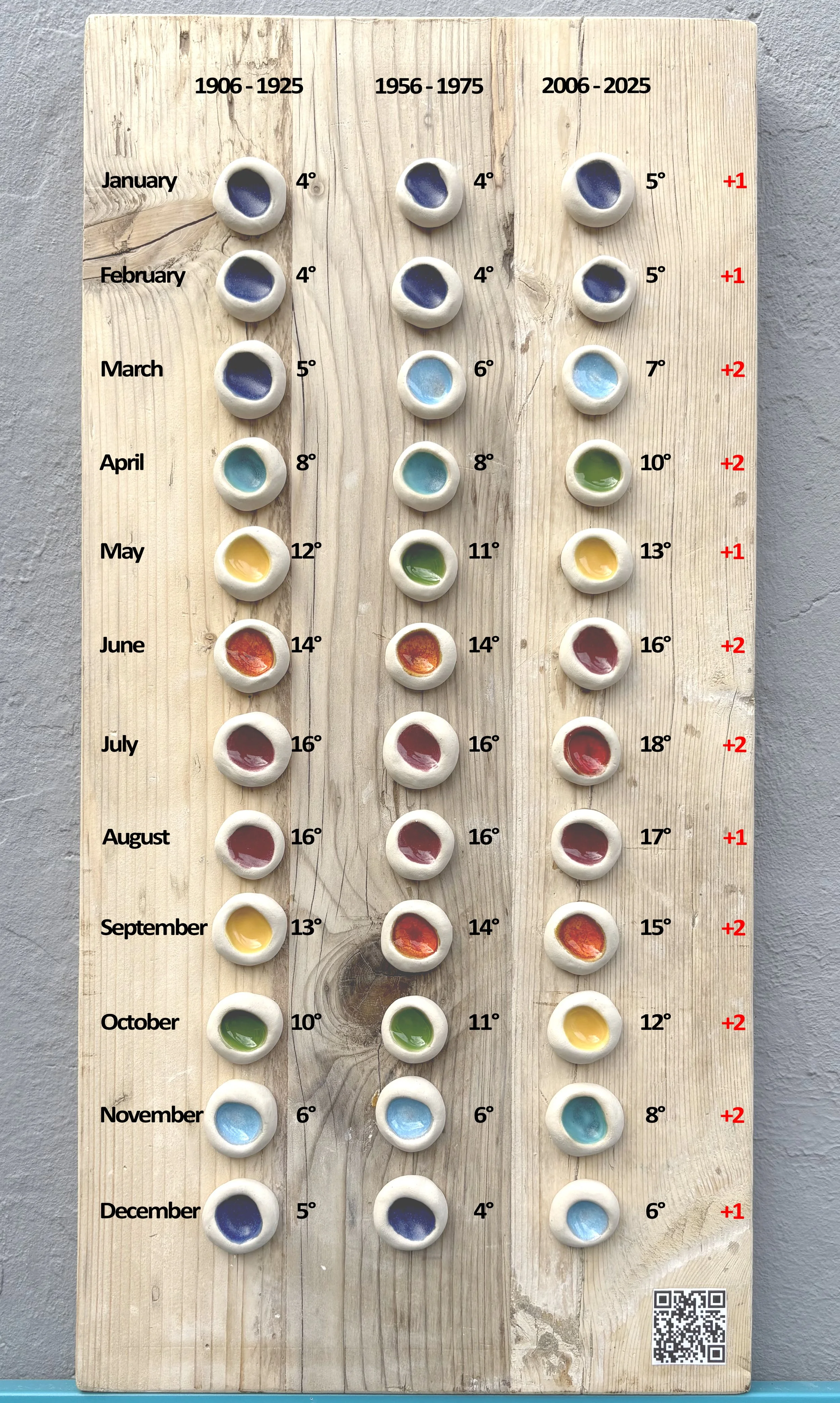 The three columns in this piece each represents a 20-year period of time (1906 – 1925; 1956 – 1975; 1996 – 2025); each row represents a month of the year; and each colour represents the average temperature in Celsius of that month (rounded to the nearest integer) for those years, with each colour corresponding to a 2°C increment. Please find an annotated photo of this piece below.
